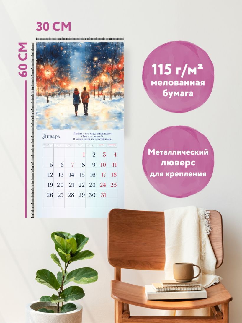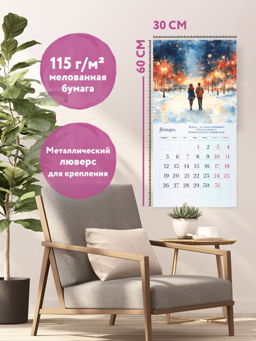 Календарь Татьяны Мужицкой с яркими иллюстрациями от Влады Коваль! В сетке — вдохновляющие цитаты автора и необычные праздники вроде «Всемирного дня “Спасибо”» и «Международного дня заботы о себе». Каждый месяц — как напоминание: жить можно с радостью, легкостью и любовью к себе. Совокупный тираж книг Татьяны Мужицкой — 360 000 экземпляров. Наши настенные календари отличаются высоким качеством исполнения! Тщательно подобранные иллюстрации, напечатанные на глянцевой бумаге высочайшего качества, станут настоящим украшением дома, а в календарной сетке найдется место для ваших планов: большие клетки позволят делать записи и организовать свой год! В серии настенных календарей издательства «ЭКСМО» каждый найдет тему по вкусу: великие художники, великолепные подборки с самыми знаменитыми произведениями искусства, легендарные кинематографические саги и игры, главные книжные авторы и бестселлеры, фотографии и иллюстрации любимых животных и многое-многое другое! Технические параметры: - Тип календаря — настенный перекидной. - Год — 2026. - Календарная сетка — с разбивкой по месяцам. - Вид скрепления — скрепка. - Ширина — 30 см. - Высота — 30 см. - Внутренний блок — мелованная бумага 150 г/м2. - Подложка — плотный гофрокартон для поддержания формы. - Индивидуальная упаковка в плотный целлофановый пакет.