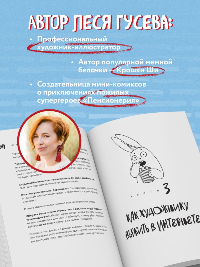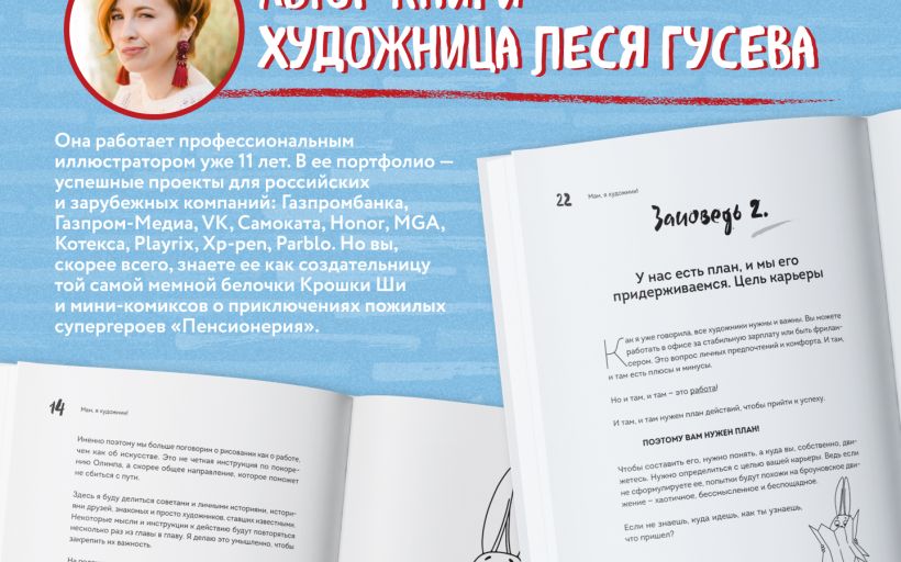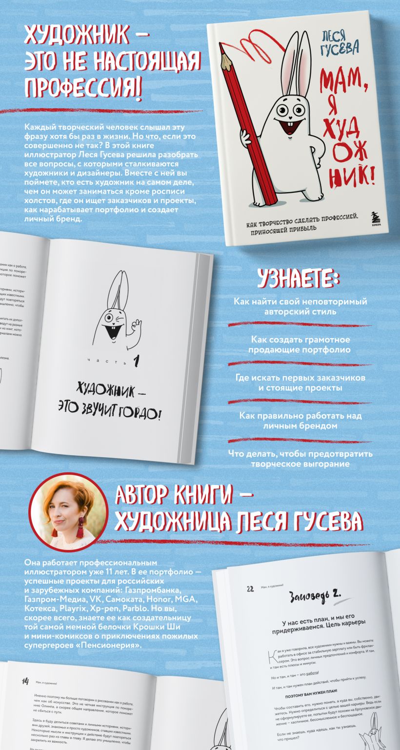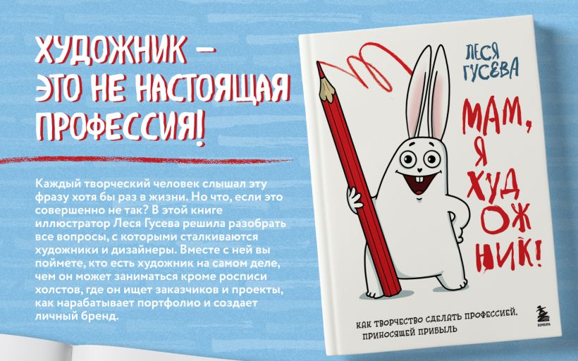 В этой книге известный художник-иллюстратор Леся Гусева решила разобрать все вопросы, с которыми сталкиваются художники, дизайнеры и иллюстраторы. Вместе с ней вы поймете, кто вообще такой художник, чем он может заниматься, где он ищет заказчиков и проекты, как составляет грамотное продающее портфолио и создает личный бренд. Кроме того, вы разберете не менее важные проблемы: выгорания, поиска себя и своей цели в карьере.