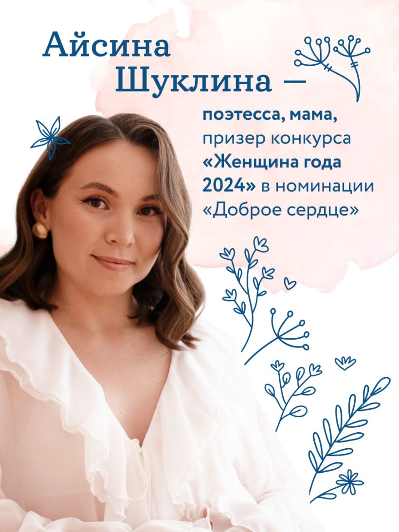 Айсина Шуклина — поэтесса, мама, призер конкурса «Женщина года 2024» в номинации «Доброе сердце». Читатели называют ее автором стихов о самых важных людях. В стихах выделяют тепло, глубину, искренность и все те трепетные чувства, о которых порой мы забываем сказать своим близким.