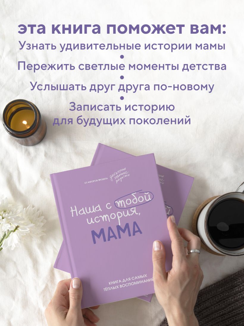 «Наша с тобой история, мама» — не просто книга, а пространство для самых тёплых воспоминаний и уникальная возможность для вас стать с мамой еще ближе. Это приглашение в личное путешествие: вспомнить, как всё было, услышать друг друга по-новому, узнать маму еще лучше и написать вашу семейную историю — вместе.