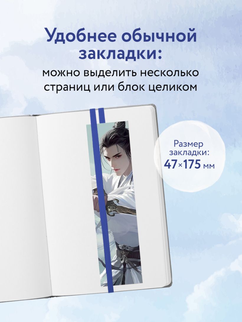 Она станет надежным помощником не только в чтении новелл, но и в учебе. Она практична и гораздо удобнее в использовании, чем обычная бумажная закладка, благодаря удобным размерам 47х175 мм и резиночке, с помощью которой можно выделить несколько страниц или «перехватить» блок целиком. А красочные дизайны с изящными небожителями будут радовать глаз в перерывах между чтением.