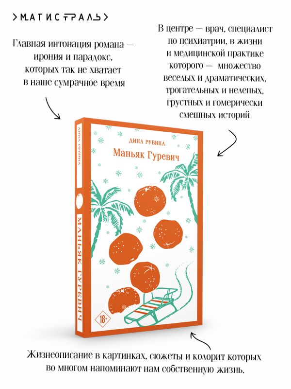 Роман «Маньяк Гуревич» не зря имеет подзаголовок «жизнеописание в картинках». Перед вами пронесутся как в калейдоскопе веселые, нелепые, грустные, пронзительные и душевные истории из жизни одного очень хорошего, но немного странного человека.