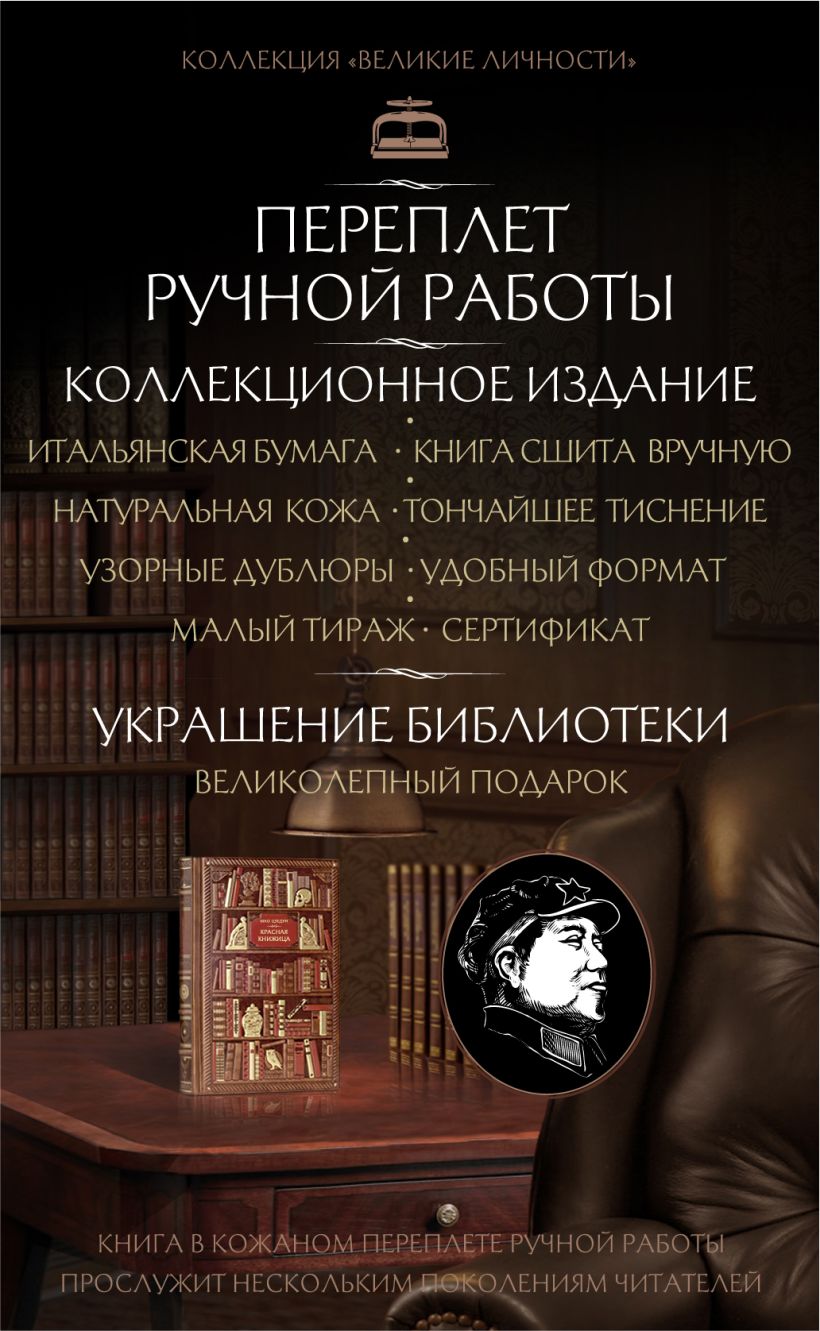 В каждом экземпляре — избранные цитаты и гравированный портрет автора, отпечатанные на дизайнерской бумаге, изготовленной на четверть из натуральной кожи. Переплеты созданы по традиционной для XIX века технологии из гладкой натуральной кожи и украшены тремя видами рельефного тиснения — золотым, рельефным и красочным. Форзацы книги из дизайнерской тонированной бумаги и тисненные золотом орнаментальные дублюры. Каптал и ляссе из шелка и трехсторонний торшонированный обрез.