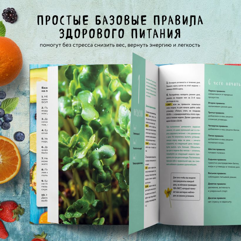 Каждая неделя — новая информация о продуктах питания и их употреблении, а также домашнее задание, которое поможет вам приблизиться к цели. Помимо теории, в книге вы найдете два варианта меню, а также более 100 рецептов полезных и вкусных блюд: от салатов в банке и полезных боулов до сгущенки без сахара и пиццы без глютена.