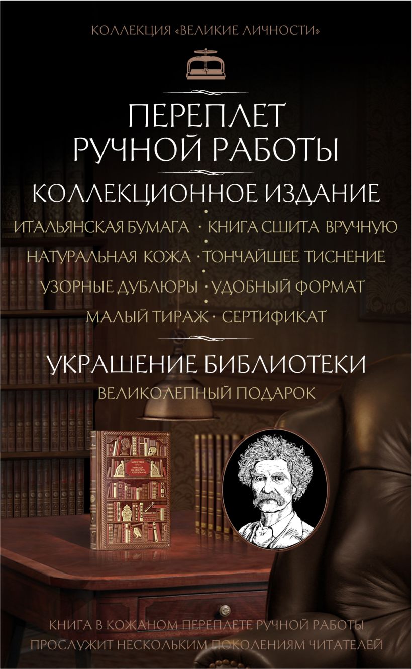 В каждом экземпляре — избранные цитаты и гравированный портрет автора, отпечатанные на дизайнерской бумаге, изготовленной на четверть из натуральной кожи. Переплеты созданы по традиционной для XIX века технологии из гладкой натуральной кожи и украшены тремя видами рельефного тиснения — золотым, рельефным и красочным. Форзацы книги из дизайнерской тонированной бумаги и тисненные золотом орнаментальные дублюры. Каптал и ляссе из шелка и трехсторонний торшонированный обрез.