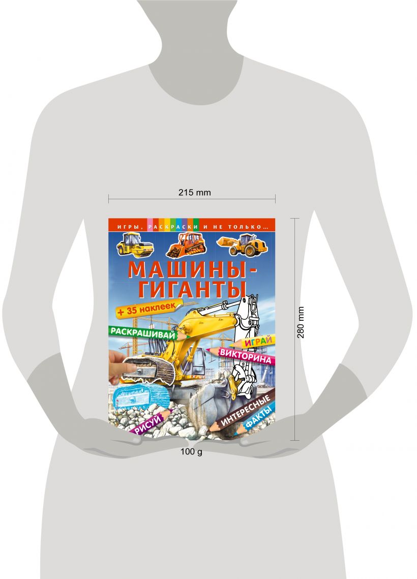 Сборник игр и раскрасок «Машины-гиганты» - это не просто красочная книга, это несколько часов увлекательного времяпрепровождения, и каждая страница этой книги откроет что-то новое и интересное для любого мальчишки - любителя машин. В этой книге есть раскраски разных видов, в том числе довольно сложная раскраска по цветовому коду, раскрасив которую можно получить настоящую картину с изображением автокрана. А еще книга поможет научиться рисовать разные строительные и дорожные машины, здесь есть непростые головоломки, очень интересная викторина, тесты с наклейками и любимое всеми детьми задание на рисование по точкам. Так что смело открывайте книгу - вас ждут страницы увлекательных (и познавательных!) развлечений.