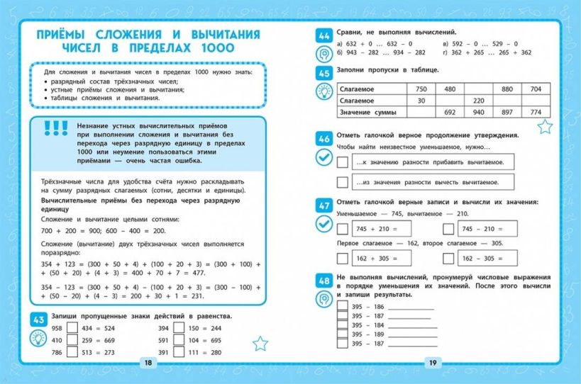 Азы математической грамотности закладываются в начальной школе. На этом этапе очень важно устранить причины ошибок, которые часто допускаются при вычислениях или математических рассуждениях. В тренажёре даны задания для предотвращения или исправления наиболее распространённых ошибок по всем темам, изучаемым в 3 классе. Ученик может определить уровень своих знаний по каждой из тем и отработать те из них, где у него выявились проблемы. Задания разного уровня сложности позволяют закрепить вычислительные навыки и самостоятельно находить ошибки. Отдельные задания снабжены подсказками и ответами.
