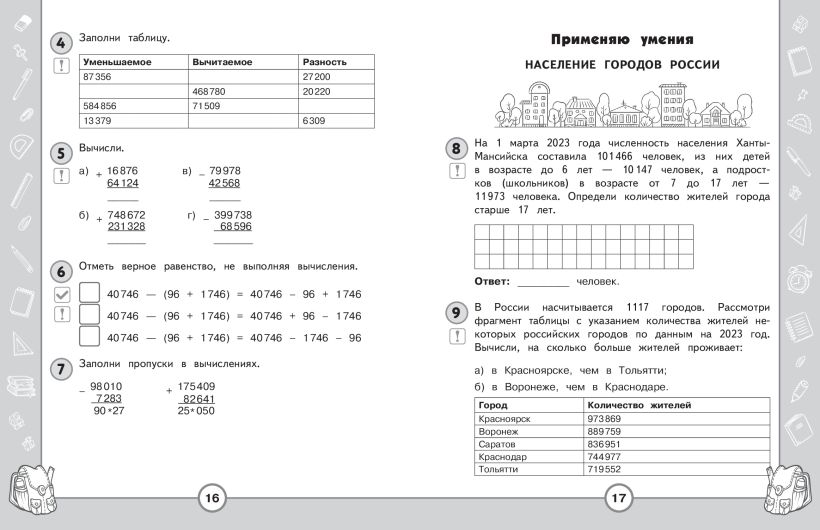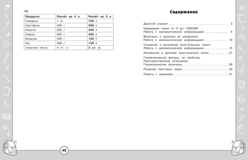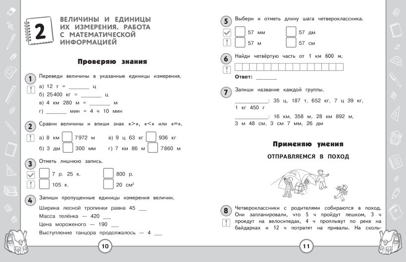 Данный тренажёр разработан для закрепления знаний и их применения. Оказывается, вычисления — это не только интересное занятие, но и очень полезный практический навык. Данный тренажёр создан с целью научить ученика четвёртого класса применять полученные знания в реальной жизни. Каждая тема содержит задания как на самопроверку знаний, так и на их применение для решения самых разных практических задач. Выполнение заданий будет способствовать развитию и математической грамотности школьника, и его функциональной грамотности.