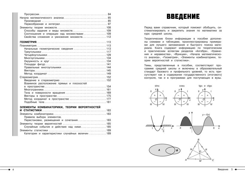 Она представит материал школьного курса математики за 5—11 классы в доступном изложении, а особый макет издания выделит главное и структурирует информацию для наилучшего запоминания. Активные поля обеспечат быстрый и точный поиск информации, сохраняя ваше время и увеличивая продуктивность. В справочнике вы найдете важные сведения по разделам «Алгебра», «Уравнения и неравенства», «Функции», «Начала математического анализа», «Геометрия», «Элементы комбинаторики, теории вероятностей и статистики». Теоретические блоки сопровождаются примерами, схемами и таблицами для комплексной подготовки к ОГЭ и ЕГЭ по математике.