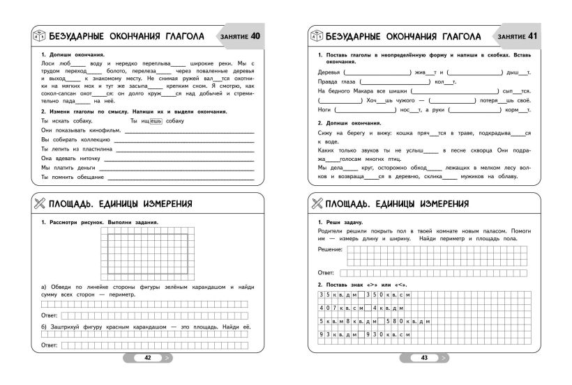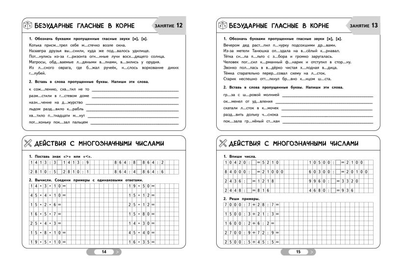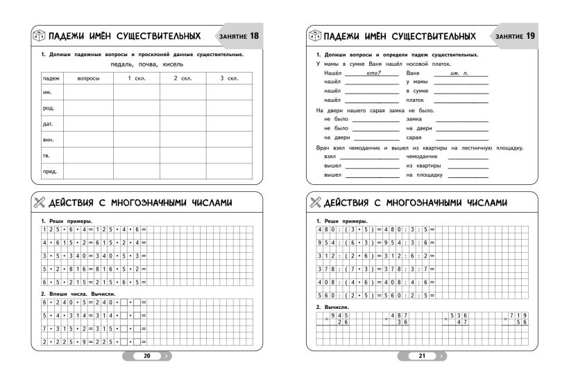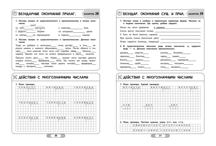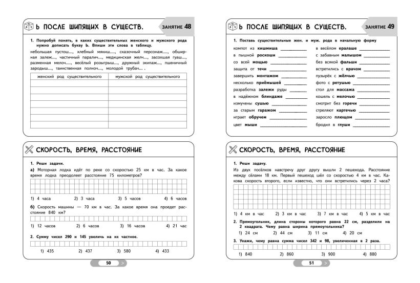 Комплексный тренажер для повторения и закрепления пройденного материала за курс 4 класса включает в себя 52 занятия по русскому языку и математике. Книга для школьников имеет необычную структуру — на каждой странице представлены задания сразу по двум предметам, которые ребенок должен выполнить за один день без помощи взрослого. В конце пособия имеются ответы для самопроверки. Занятия в летние каникулы должны длиться не более 30 минут, чтобы ребенок не утомлялся и в то же время смог закрепить навыки за школьный курс 4 класса.