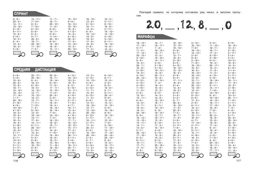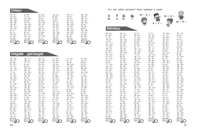 Научиться мгновенно считать в уме, не делая при этом ошибок, может любой школьник. Для этого нужно систематически и в большом объёме выполнять задания на каждое математическое действие. В этом тренажёре ученику предлагается решить 30 000 примеров по всем темам программы по математике за курс 1 класса. Выполнив такое количество примеров, школьник надёжно закрепит полученные знания и доведёт навык устного счёта до полного автоматизма. Благодаря регулярной работе с тренажёром первоклассник сможет оценить уровень своих знаний и заметно его повысить.