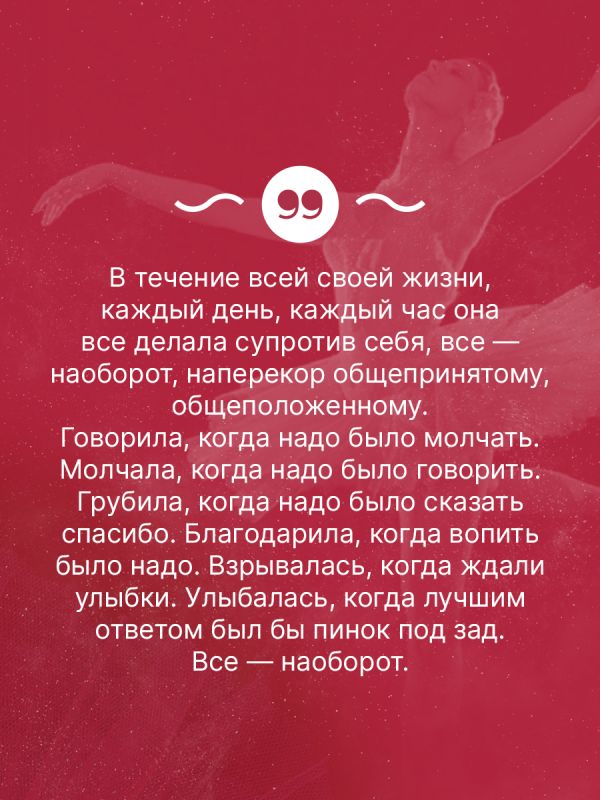 Эта книга — нежный и трогательный поклон великой балерине. Перед читателем откроется история триумфа примы, покорившей весь мир, и девочки, которую от детдома спасла любовь тети и магия балета.