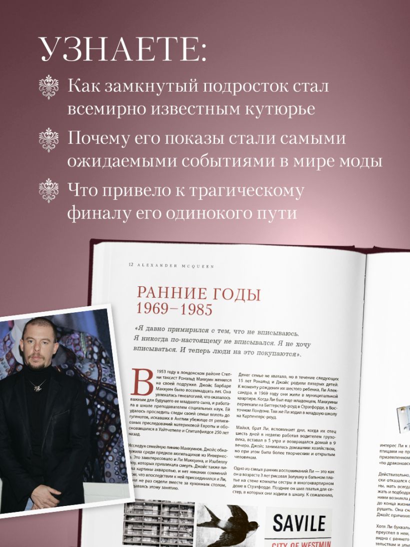 Александр Маккуин был революционером визуального языка моды. Автор книги Майкл О’Нил поднимает завесу над малоизвестными этапами жизни творца, показывая, как юноша из скромной лондонской семьи превратился в культовую фигуру fashion-мира, чья карьера была полна драм, скандалов, взлетов и падений. Редкие архивные фотографии, эскизы и закулисные кадры раскрывают путь мастера, для которого мода стала формой исповеди и искусства на грани.