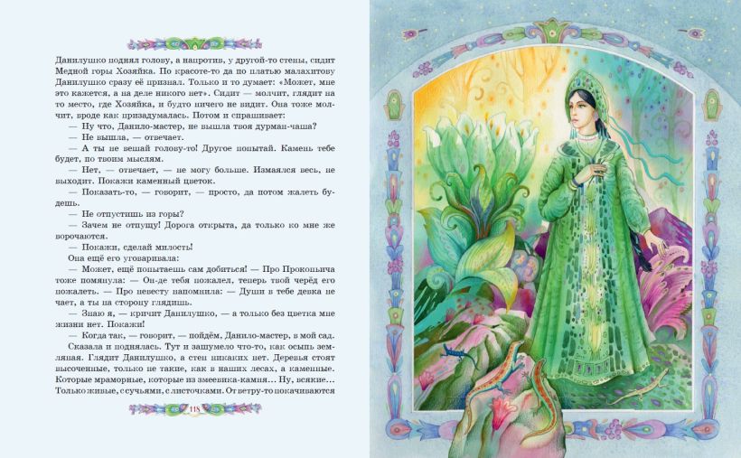 Чудесные иллюстрации современной художницы Елены Шафранской созданы в традиционном русском стиле. Они позволят заглянуть и в сказочные чертоги владычицы Уральских гор, и в волшебный каменный лес, и в барский особняк. От образов простых людей — мастеров, старателей, рабочих — словно веет настоящим, живым теплом. А Хозяйка является в разных обличьях, но всякий раз ее несложно узнать.
