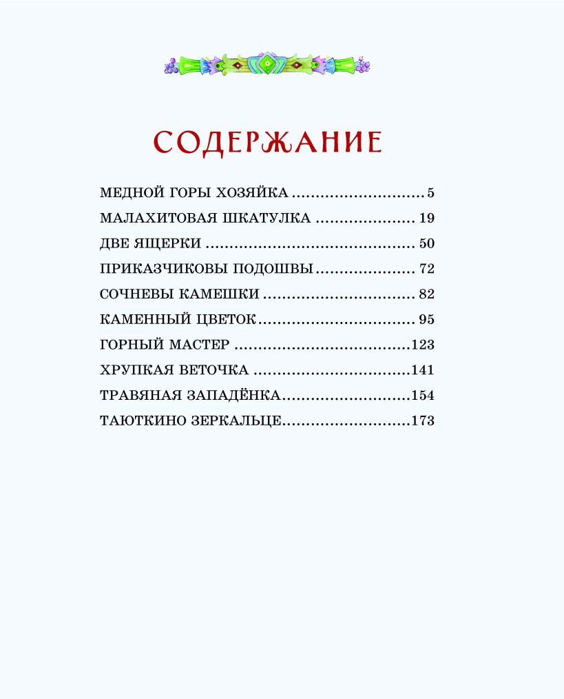 В книгу вошли 10 сказов: «Малахитовая шкатулка», «Каменный цветок», «Горный мастер», «Таюткино зеркальце» и другие.