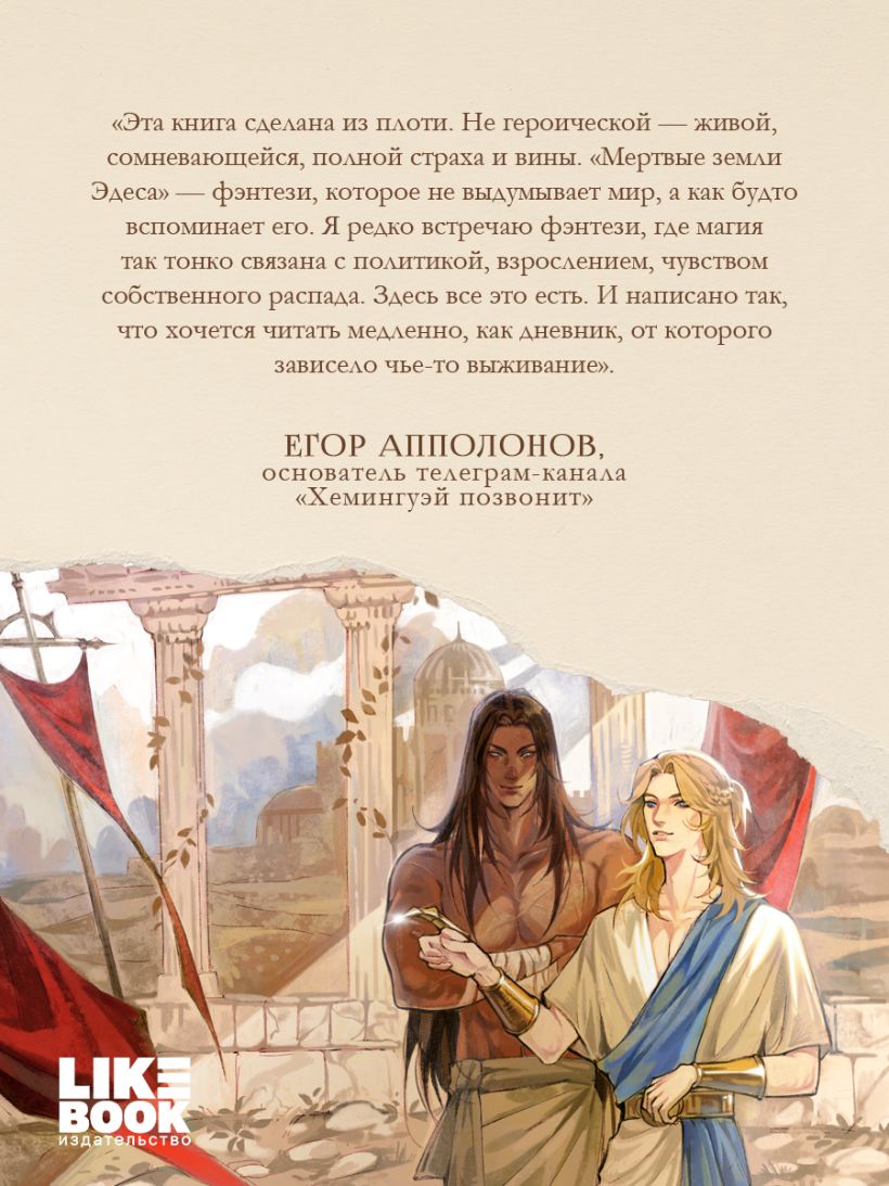 «Эта книга сделана из плоти. Не героической — живой, сомневающейся, полной страха и вины. „Мертвые земли Эдеса“ — фэнтези, которое не выдумывает мир, а как будто вспоминает его. Словно автор где-то был, что-то видел, а потом пытался забыть, но не смог. И вот теперь мы вместе с ним идем по этим землям — в империи, где печать „весит“ больше судьбы, а жизнь — не стоит ничего. Я редко встречаю фэнтези, где магия так тонко связана с политикой, взрослением, чувством собственного распада. Здесь все это есть. И написано так, что хочется читать медленно, как дневник, от которого зависело чье-то выживание.