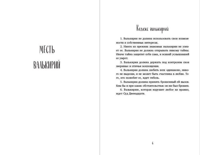 «Валькирия не может полюбить. Валькирия обязана принять вызов, кем бы он ни был брошен. Никто из встречавших валькирию прежде никогда не узнает её, иначе тайна защитит себя сама, и всякий услышавший её умрёт».