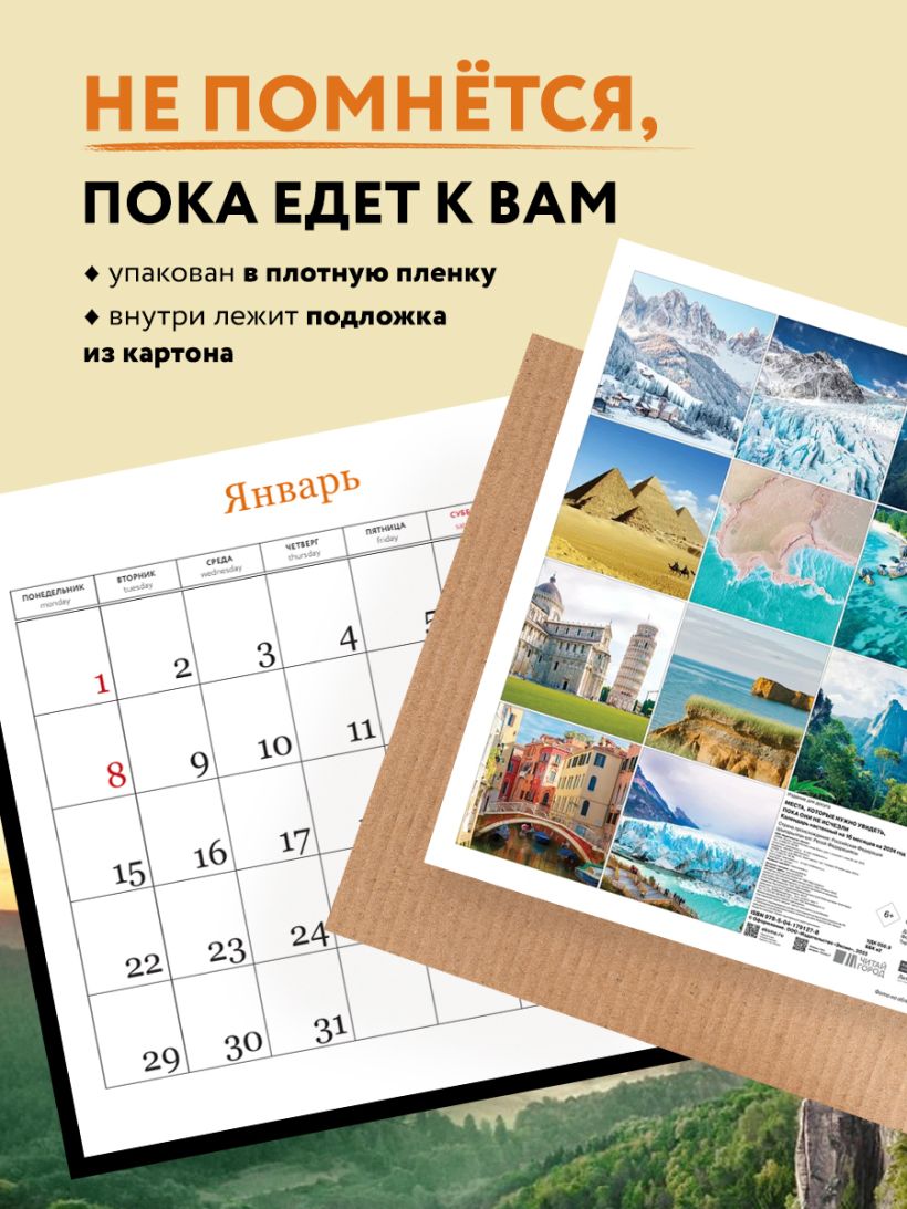 Благодаря большому формату и высокому качеству изображений этот календарь может стать отличным дополнением интерьера. В нем также отмечены выходные дни, а просторная сетка позволяет удобно планировать время и записывать важные события.