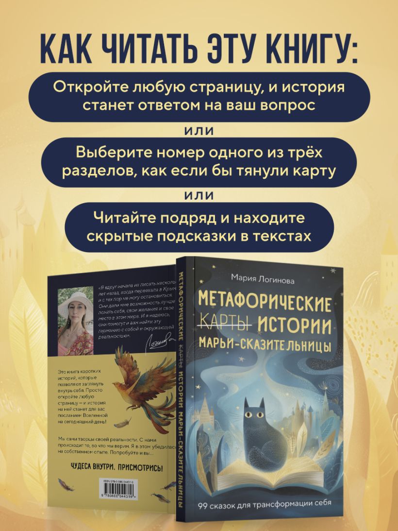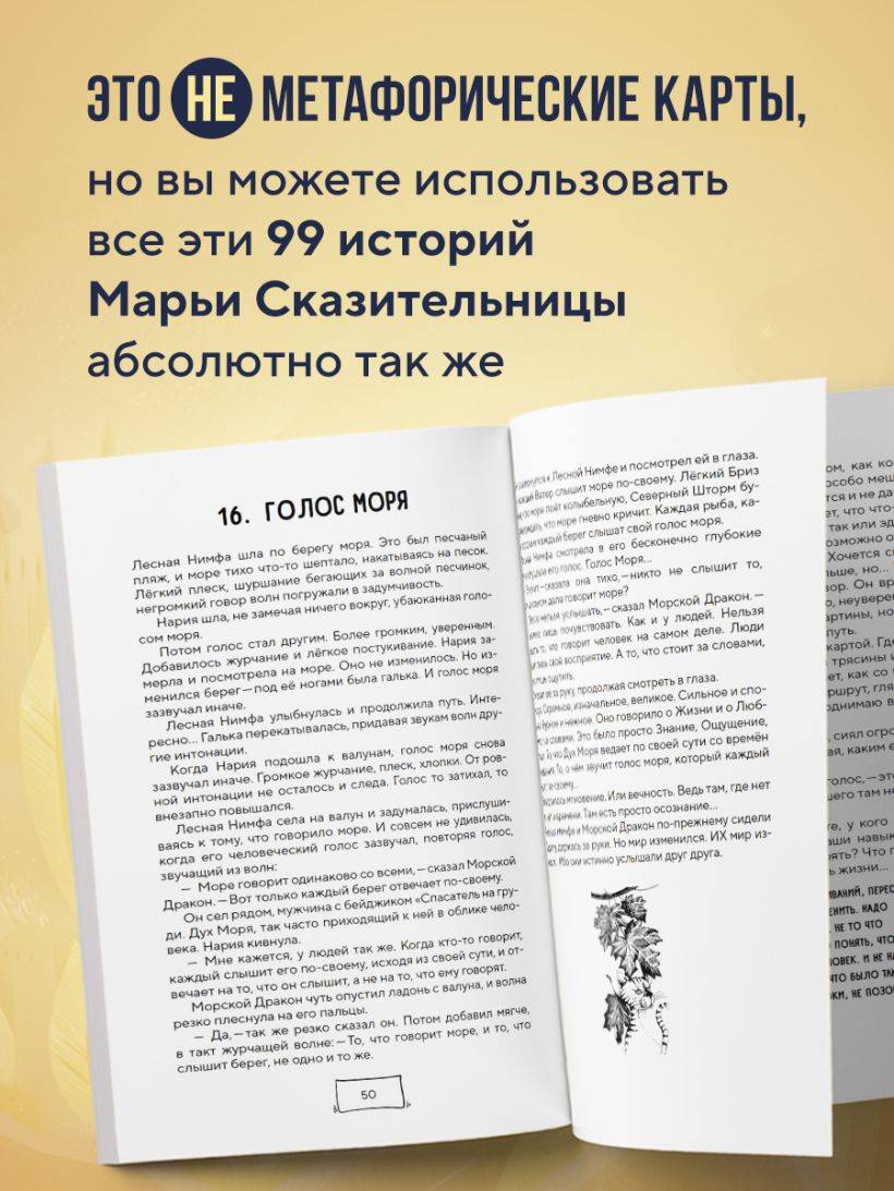 Это не метафорические карты, но вы можете использовать все эти 99 историй Марьи Сказительницы абсолютно так же. Можно просто открыть книгу на любой странице, и история, которая выпала вам, будет содержать ответ на ваш запрос или стать предсказанием на день, начало недели или выходные.