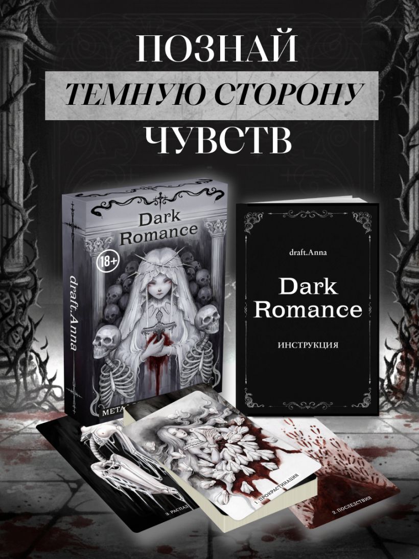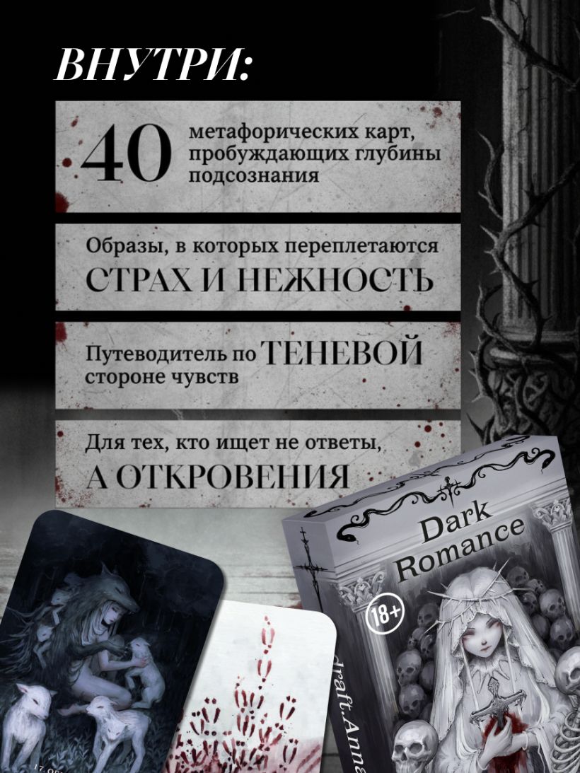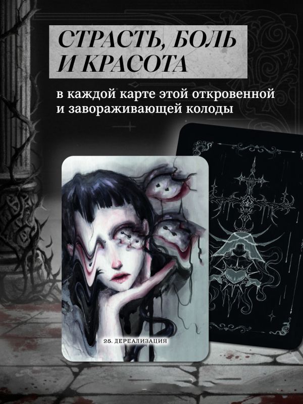 Эта авторская колода дает возможность заглянуть в бездну своего «Я» и найти ответы на давно волнующие вопросы, скрытые в самой глубине подсознания. Впрочем, людям, не интересующимся психологией, эта колода также будет интересна: этот проект можно рассматривать как необычный артбук, включающий в себя работы современной художницы draft.Anna, которые не оставят равнодушным ни одного любителя темного искусства.