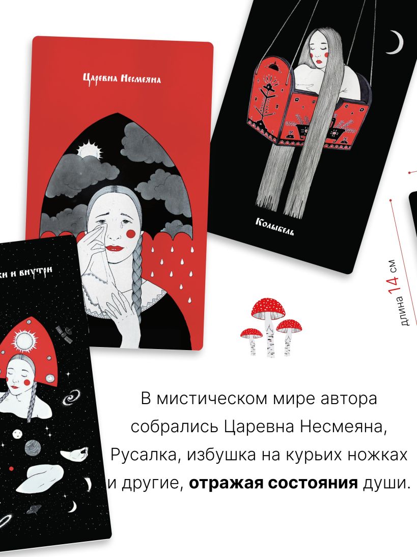 Авторская колода поможет совершить путешествие в чертоги подсознания, прислушаться к своему внутреннему голосу, а также увидеть себя настоящую «во всей красе». Колода станет проводником к целебным внутренним ресурсам, которые облегчат прохождения непростых жизненных этапов, помогут восстановить силы, обрести веру в себя и свои возможности. Образы, которые находятся в колоде, благодаря созвучию многим состояниям, дадут правильный вектор на пути разрешения внутренних противоречий и душевных чаяний. Колода является неким сеансом терапии, мягко поддерживающим и дающим бережный совет, как восстановить душевное равновесие.
