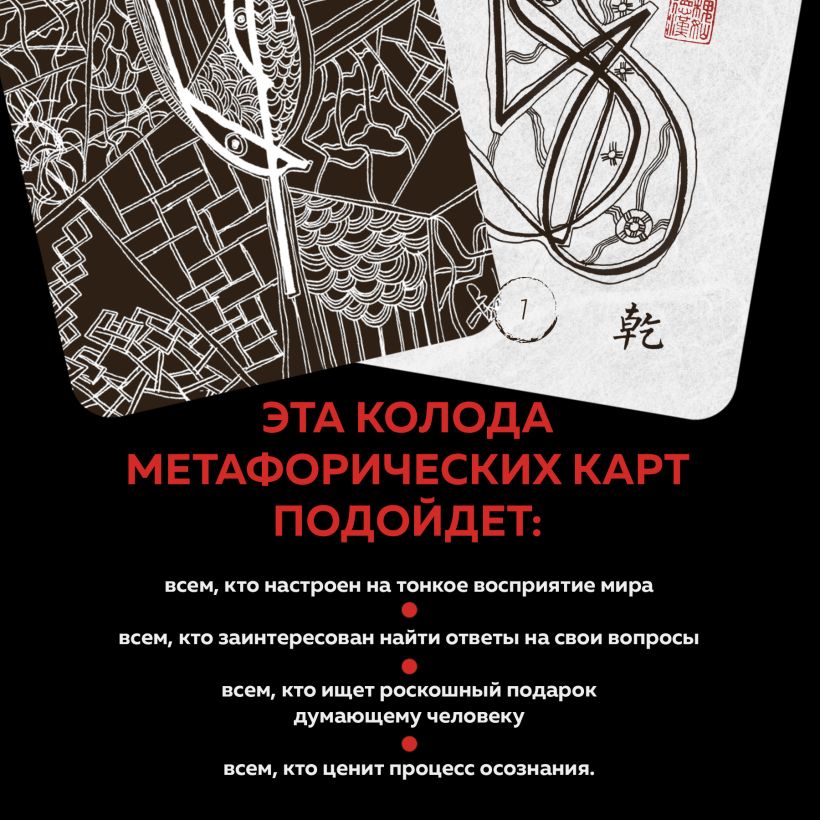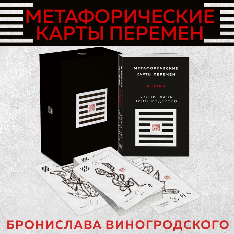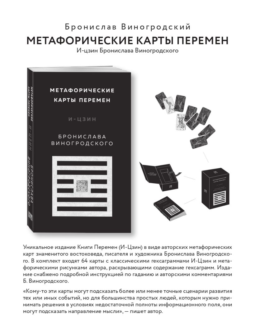 Уникальное издание Книги Перемен (И-Цзин) в виде авторских метафорических карт знаменитого востоковеда, писателя и художника Бронислава Виногродского. В комплект входят 64 карты с классическими гексаграммами И-Цзин и метафорическими рисунками автора, раскрывающими содержание гексаграмм. Издание снабжено подробной инструкцией по гаданию и авторскими комментариями Б. Виногродского.