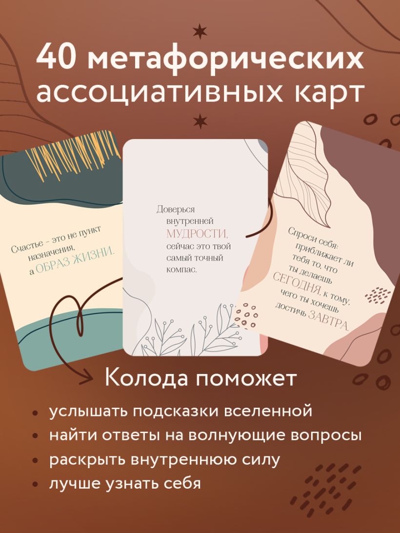 На каждой карте метафорический фон настраивает на нужное состояние, а фразы-послания подсказывают, на что стоит обратить внимание по волнующему вопросу. Колода создана так, чтобы ощущения, ассоциации, интуитивное восприятие и приходящие от созерцания фраз мысли наводили на искомый ответ и раскрывали внутренний ресурс человека.