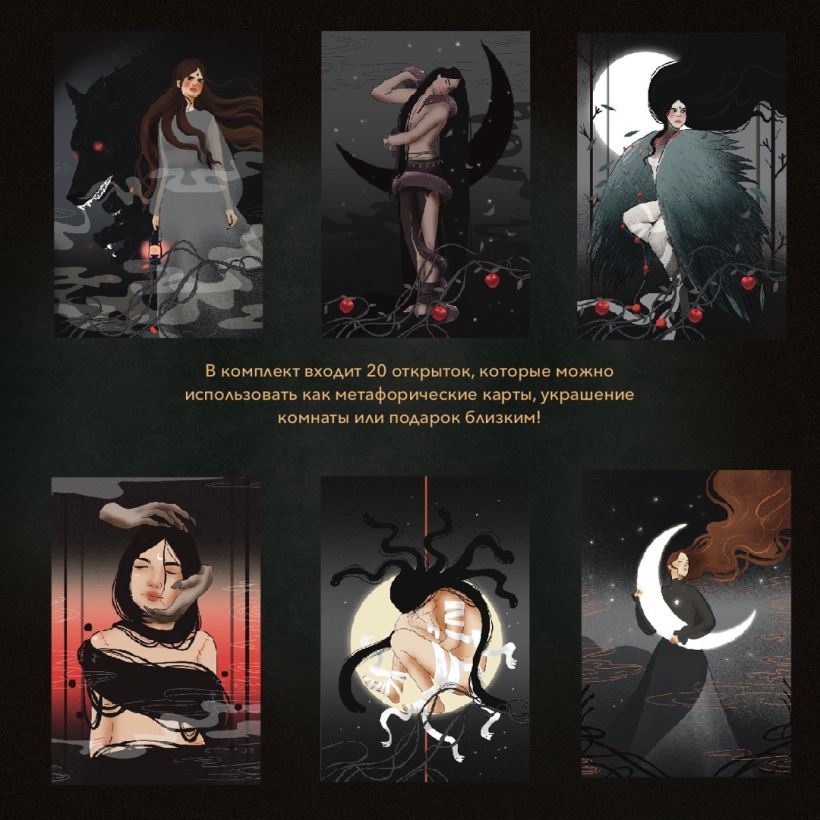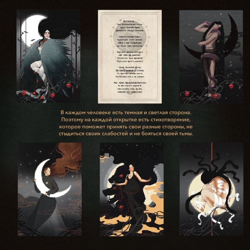 В каждом человеке есть темная и светлая сторона. Поэтому на каждой открытке есть стихотворение, которое поможет принять свои разные стороны, не стыдиться своих слабостей и не бояться своей тьмы.