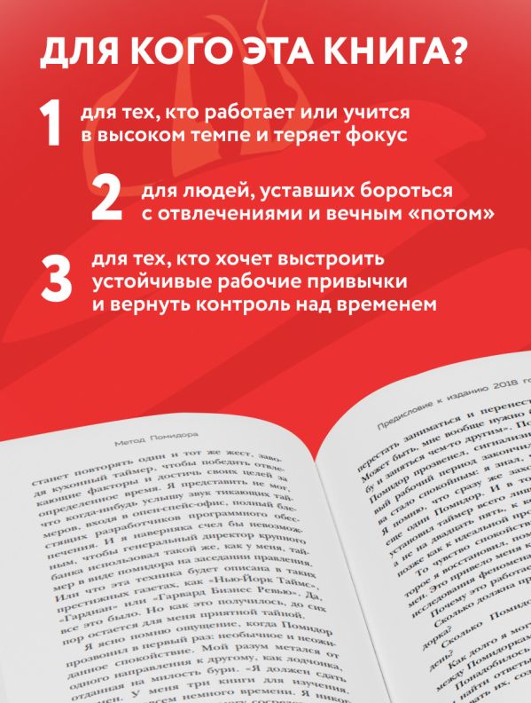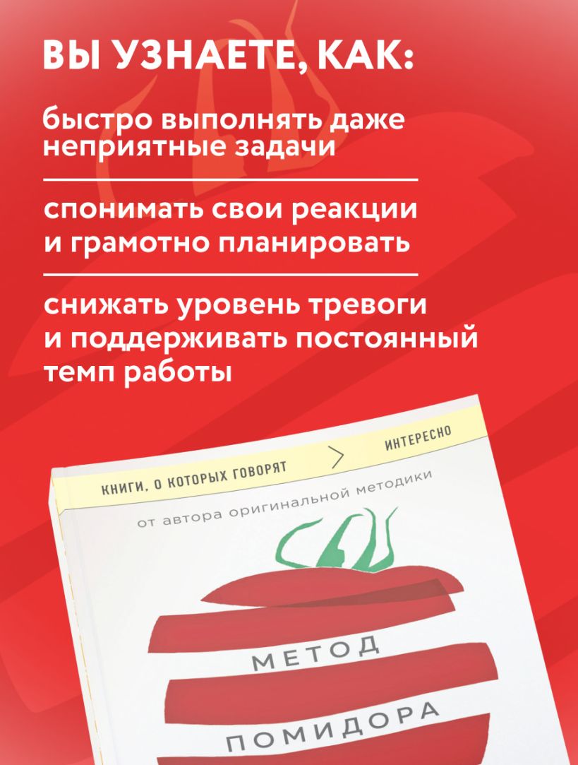 «Автор "Метода помидора" на конкретных примерах показывает, как грамотно распланировать дела на день, меньше отвлекаться и больше успевать. Книга будет полезна всем, кто хочет освободиться от беспокойства по поводу сложных задач, перестать откладывать дела на потом и наконец-то взять своё время под контроль». — Наталья Скорнякова, редактор «Лайфхакера»