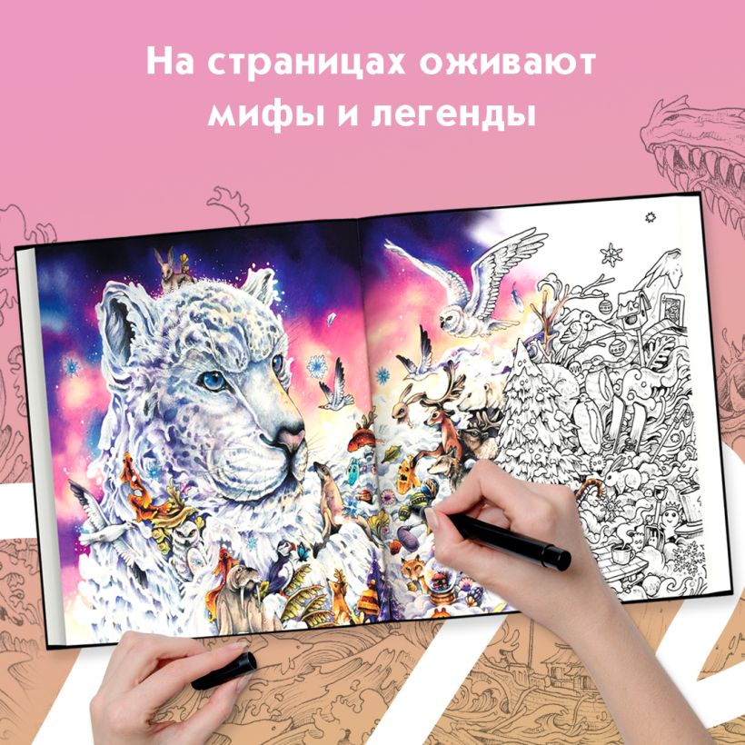 Все рисунки выполнены тонкой капиллярной ручкой и полны мельчайшей деталей и высокой четкости. Отправляйтесь в невероятное мифическое путешествие за пределы цвета вместе с этой экстремальной раскраской!