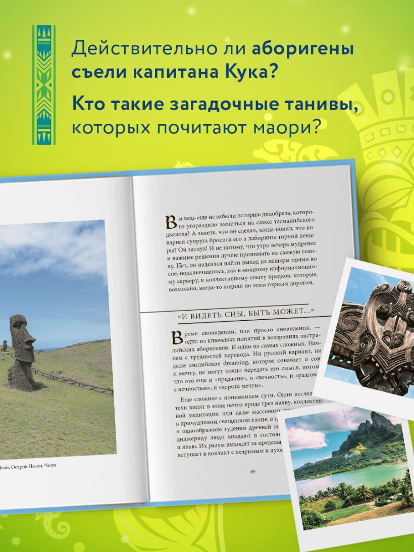 Вы побываете в самых удаленных уголках планеты, в глубине Зеленого континента и на вулканах Гавайских островов, познакомитесь с культурой воинственных маори, исконных жителей Новой Зеландии, и с историей каменных истуканов острова Пасхи. Узнаете, какие места запрещено фотографировать даже для Google Maps, где Питер Джексон снимал культовую трилогию «Властелин колец» и действительно ли аборигены съели капитана Кука.