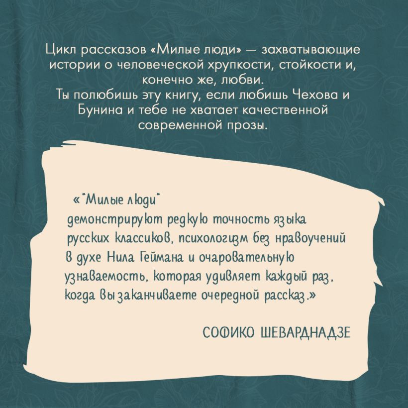 Цикл рассказов «Милые люди» — захватывающие истории о человеческой хрупкости, стойкости и, конечно же, любви.