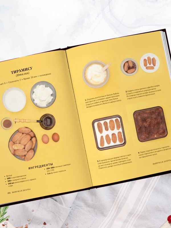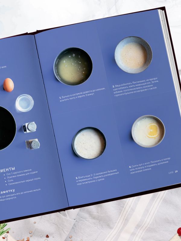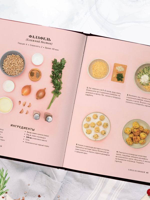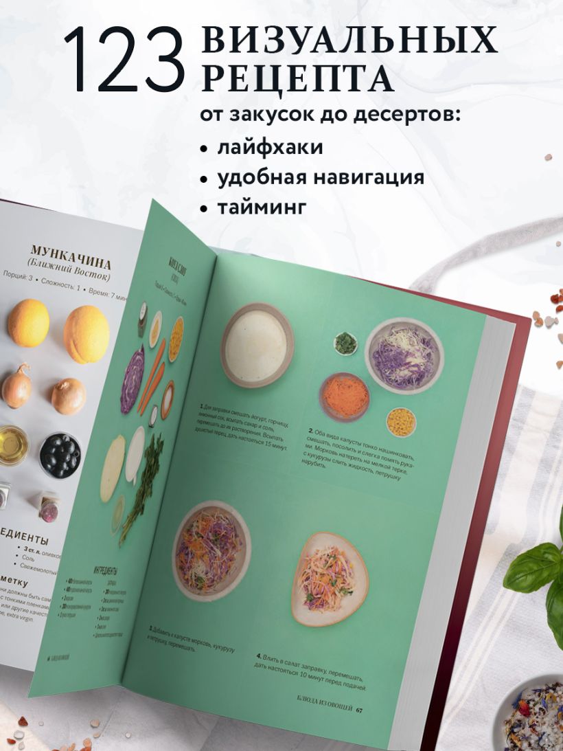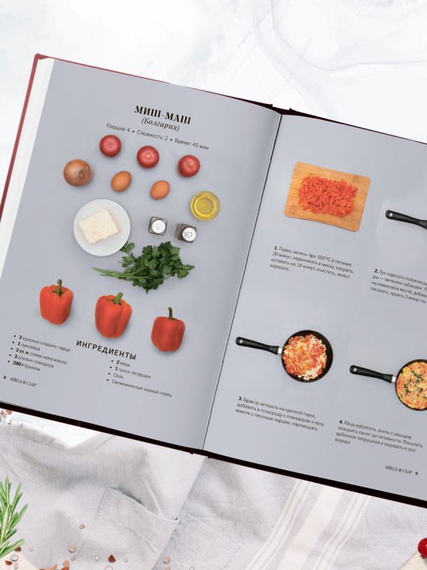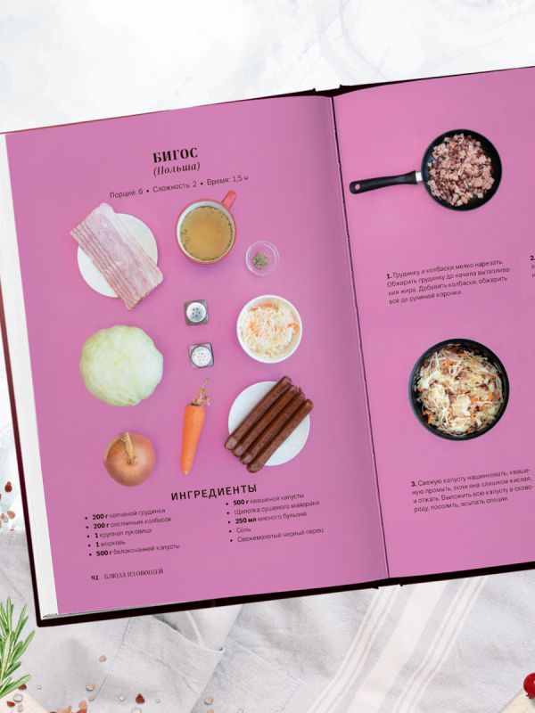 - яркие иллюстрации ингредиентов и пошаговые инструкции по приготовлению.