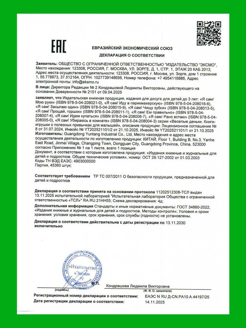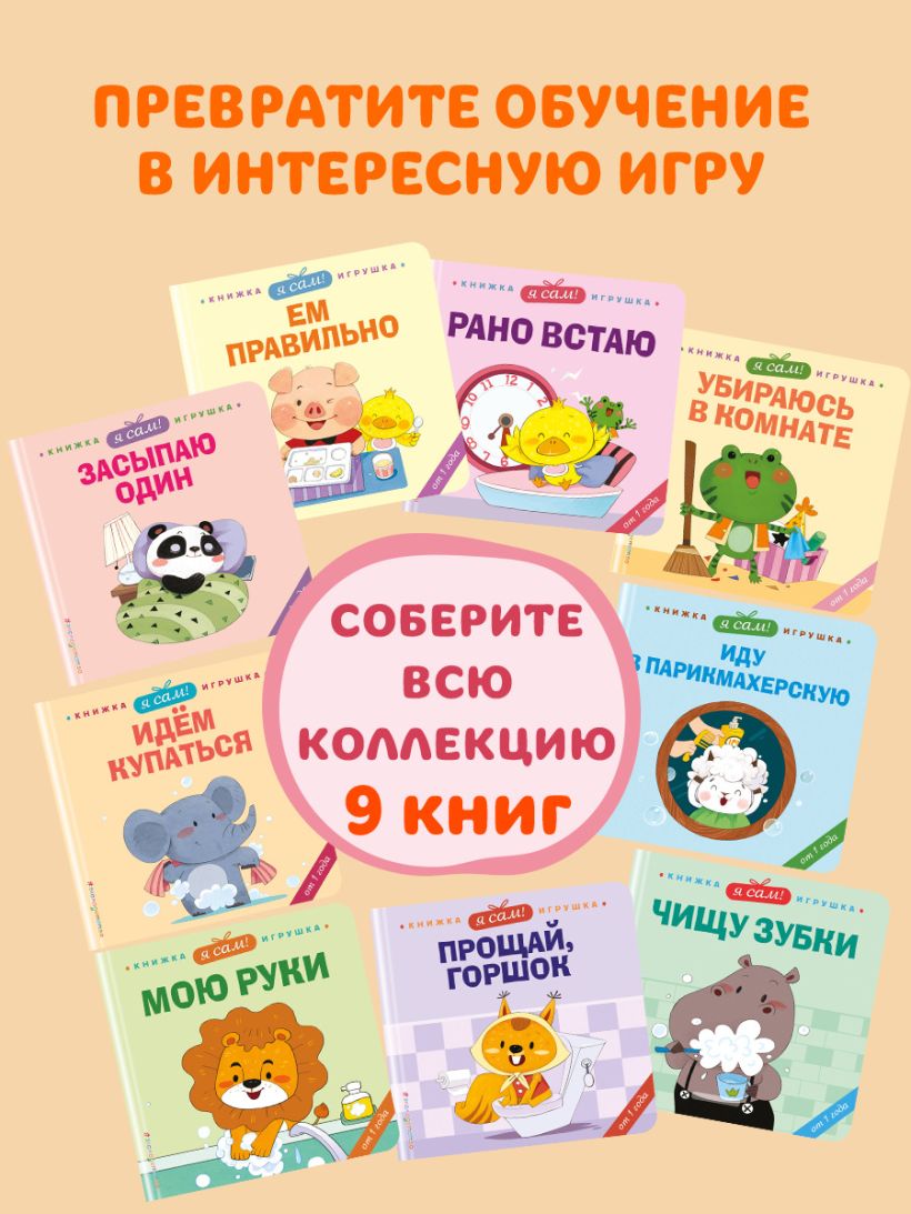 Выучите все полезные привычки в других книгах серии «Веселые деньки. Книги-игрушки о полезных привычках для малышей»: «Я сам! Ем правильно», «Я сам! Засыпаю один», «Я сам! Идем купаться», «Я сам! Мою руки», «Я сам! Прощай, горшок», «Я сам! Рано встаю», «Я сам! Убираюсь в комнате», «Я сам! Чищу зубки».