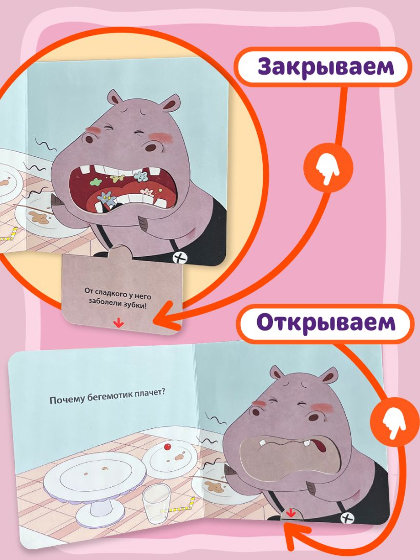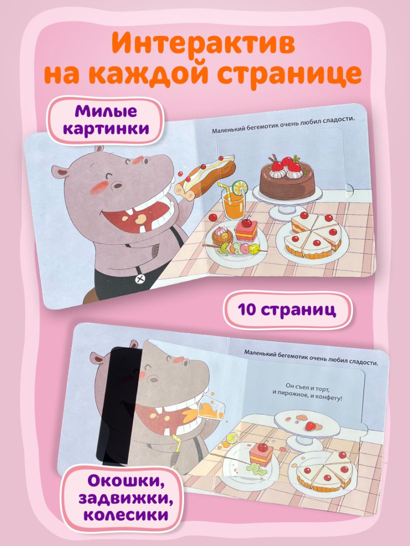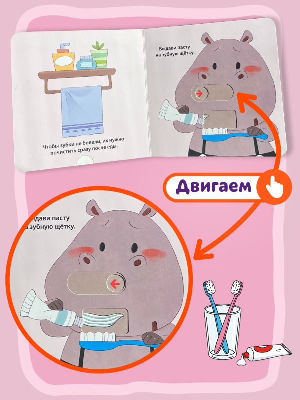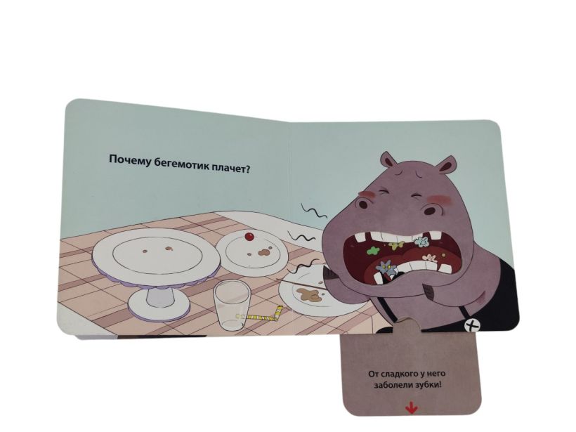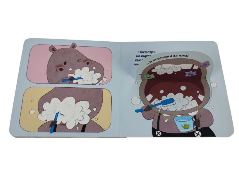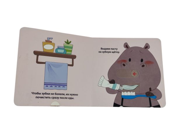 Маленький бегемотик очень любил сладости, но не любил чистить зубы. Неудивительно, что однажды они у него заболели! Помогите Бегемотику научиться правильно держать щетку, выдавливать пасту и хорошо чистить зубки.