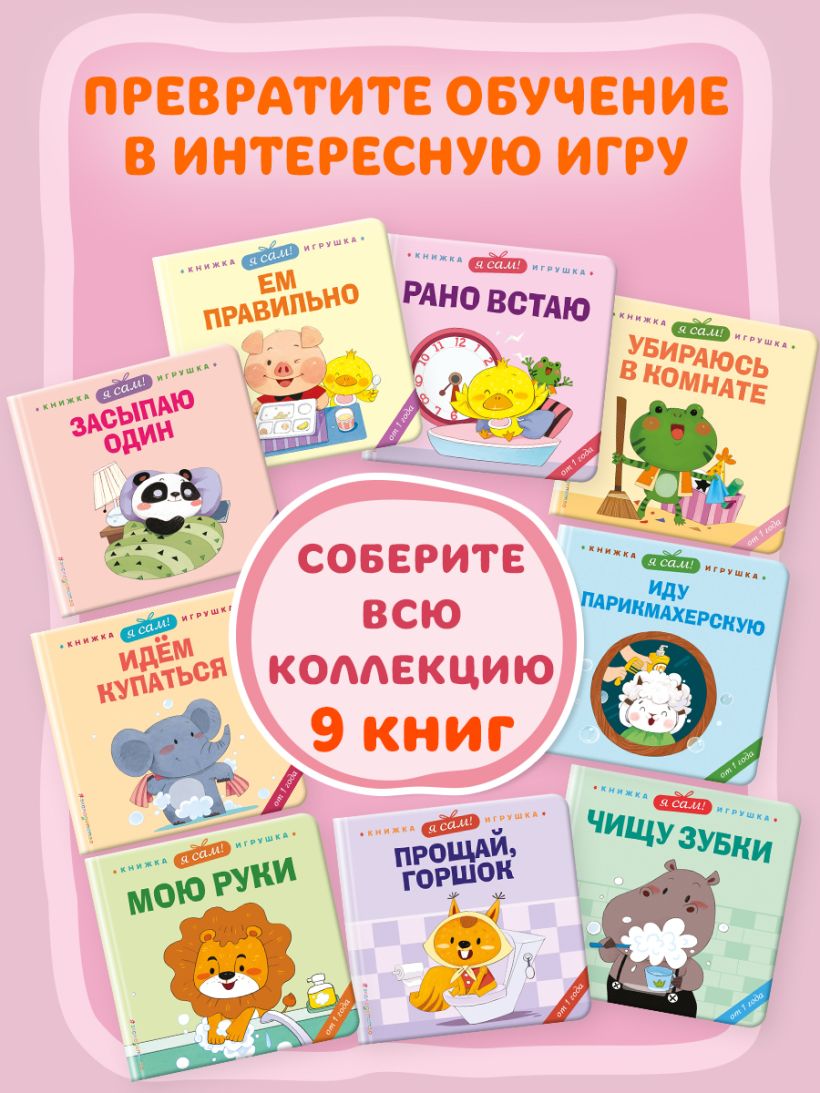 Выучите все полезные привычки в других книгах серии «Веселые деньки. Книги-игрушки о полезных привычках для малышей»: «Я сам! Ем правильно», «Я сам! Засыпаю один», «Я сам! Иду в парикмахерскую», «Я сам! Идем купаться», «Я сам! Мою руки», «Я сам! Прощай, горшок», «Я сам! Рано встаю», «Я сам! Убираюсь в комнате».