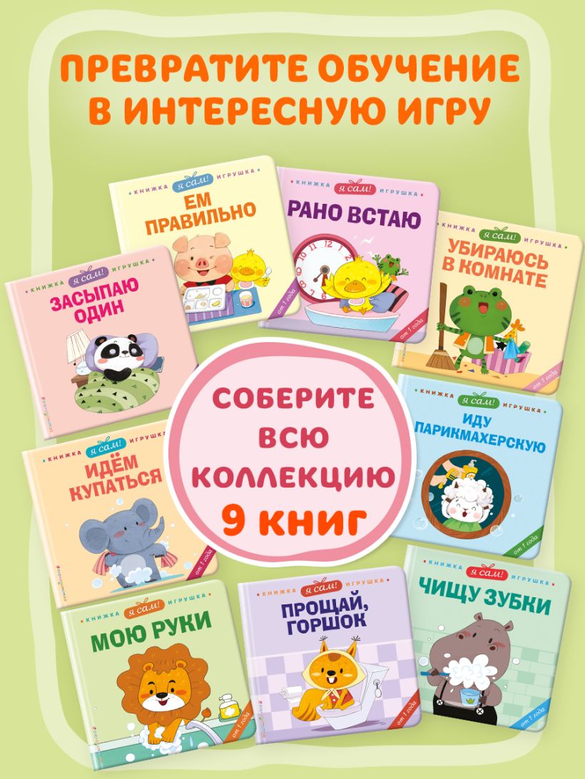 Выучите все полезные привычки в других книгах серии «Веселые деньки. Книги-игрушки о полезных привычках для малышей»: «Я сам! Ем правильно», «Я сам! Идем купаться», «Я сам! Иду в парикмахерскую», «Я сам! Мою руки», «Я сам! Прощай, горшок», «Я сам! Рано встаю», «Я сам! Убираюсь в комнате», «Я сам! Чищу зубки».