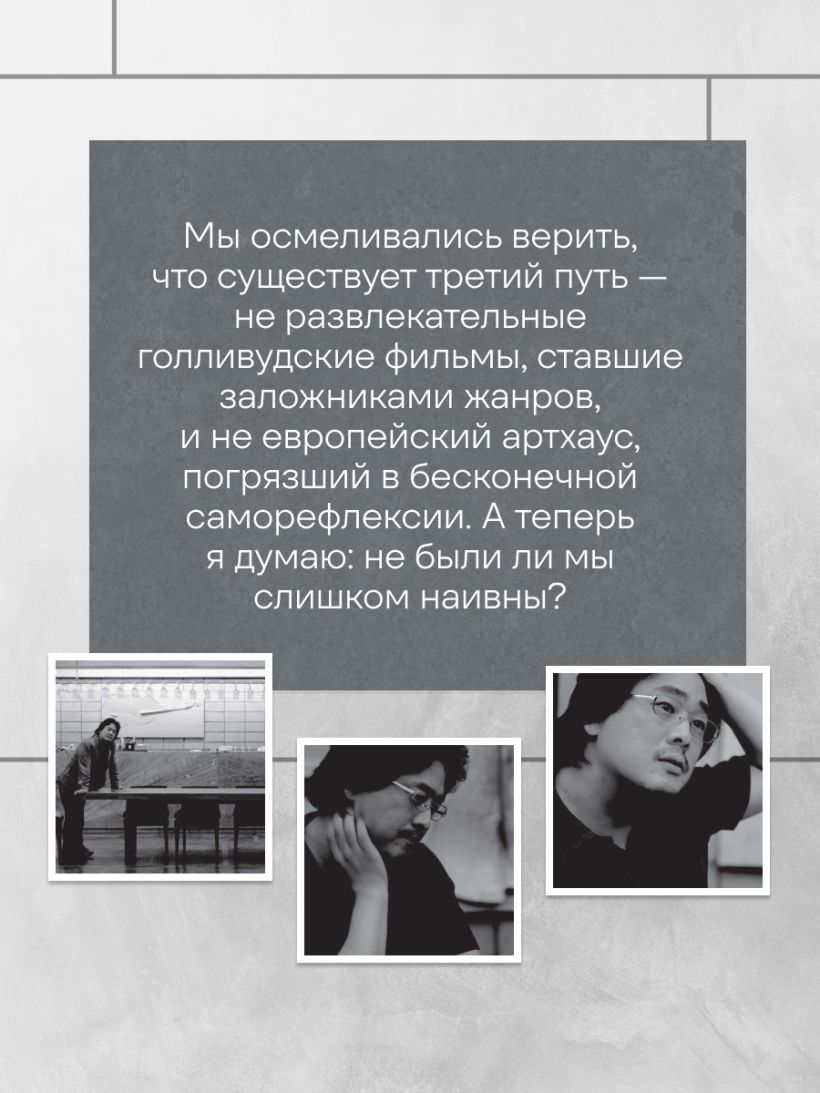 Погрузитесь в искренние и глубокие размышления автора о жизни, искусстве и поиске себя. Сквозь призму детских впечатлений, любви к аутсайдерскому кино (от Тома Уэйтса до фильмов категории B) и анализа творчества мастеров (Ким Гиён, Скорсезе) он откровенно исследует вечные дилеммы: как сохранить бунтарский дух перед лицом цензуры, найти баланс между коммерцией и искренностью и почему творческая свобода — основа всего.