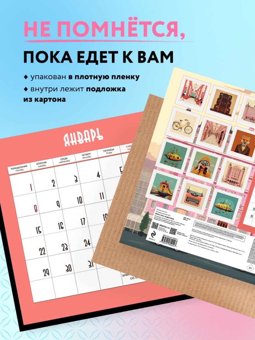 Идеальный календарь для поклонников гениального режиссера Уэса Андерса! Качественная бумага, большой формат (300х300 мм) и креативная яркая сетка с иллюстрациями по любимым фильмам! Отличный подарок фанатам!