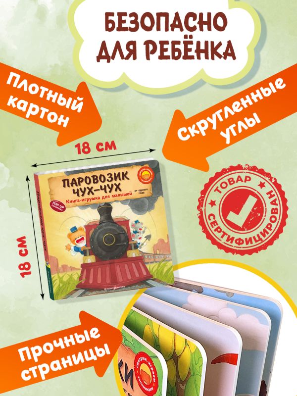 Отличный подарок для детей от 1 года до 3 лет! Все страницы и элементы книги имеют безопасную скруглённую форму и сделаны из прочного картона, который не под силу порвать малышу. А удобный формат позволяет играть с книгой не только дома, но и на улице.