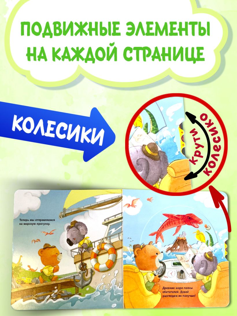 «Книжки-игрушки для малышей» — это целая серия интерактивных изданий с подвижными элементами для самых маленьких! Крутящиеся колёсики и выдвижные панели с картинками дополняют сюжет новыми подробностями. Играем, тренируем пальчики и запускаем речь! Мишка надевает акваланг, ласты и вместе с друзьями отправляется в подводную экспедицию. Давай с нами! Ты только посмотри, сколько здесь необычных существ! Здесь и скаты с большими крыльями, и рак с мощными клешнями, а на самой глубине притаилась рыбка с фонариком на голове. А это что? Неужели… самый настоящий затонувший корабль с сокровищами? Скорее на абордаж! Детализированные красочные иллюстрации на весь разворот очаруют не только детей, но и взрослых. Рассматривайте их с малышом, обсуждайте прочитанное, придумывайте свою историю! Отличный подарок для детей от 1 года до 3 лет! Все страницы и элементы книги имеют безопасную скруглённую форму и сделаны из прочного картона, который не под силу порвать малышу. А удобный формат позволяет играть с книгой не только дома, но и на улице.