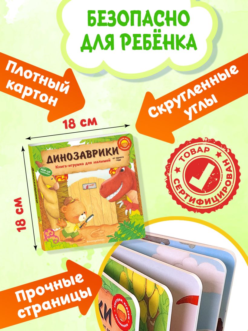 Отличный подарок для детей от 1 года до 3 лет! Все страницы и элементы книги имеют безопасную скруглённую форму и сделаны из прочного картона, который не под силу порвать малышу. А удобный формат позволяет играть с книгой не только дома, но и на улице.