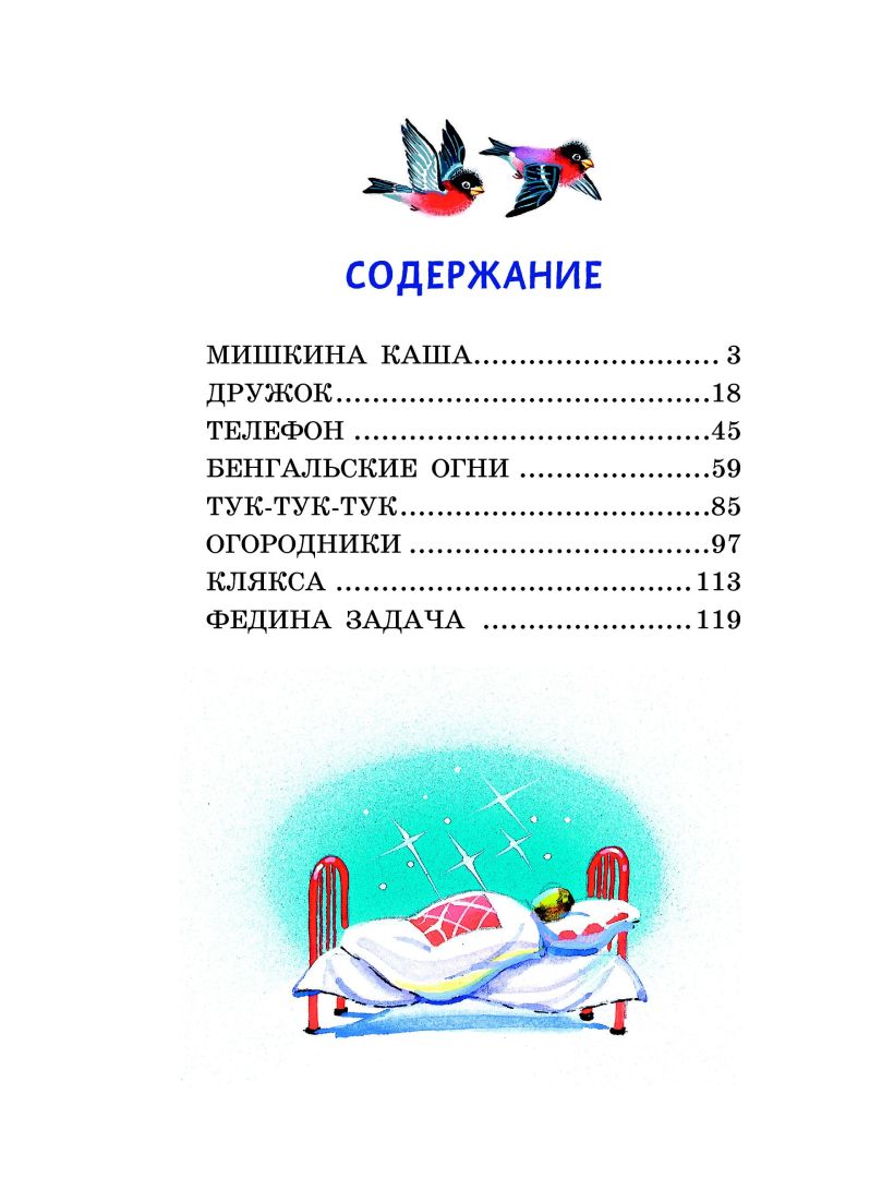 В сборник «Мишкина каша» вошло восемь рассказов о приключениях двух друзей Коли и Миши и о незадачливом Феде Рыбкине: «Мишкина каша», «Телефон», «Огородники», «Федина задача» и другие.