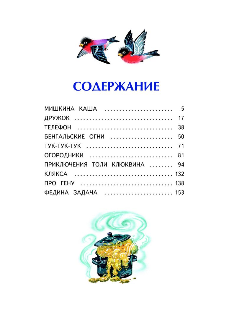 В сборник вошло 10 рассказов: «Мишкина каша», «Дружок», «Телефон», «Огородники», «Приключения Толи Клюквина» и другие.