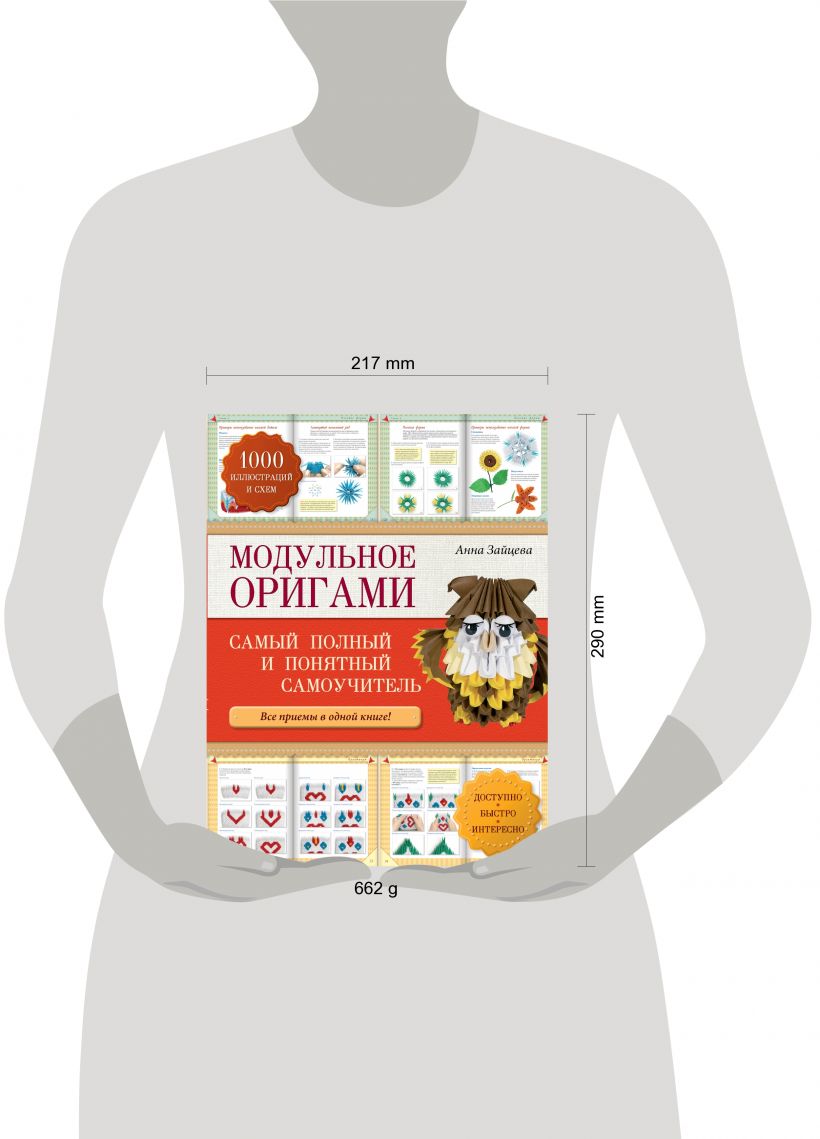 Представляем вашему вниманию невероятно подробный иллюстрированный самоучитель по самой популярной бумажной технике – модульному оригами. На его страницах вы найдете всю необходимую информацию о том, как складывать треугольные модули, соединять их словно детали конструктора между собой различными способами, создавая уникальные поделки. Самоучитель написан известным российским дизайнером Анной Зайцевой по принципу "от простого к сложному", снабжен огромным количеством пошаговых фотографий, подробными описаниями, а также ценными советами и хитростями, которые помогут вам с легкостью освоить все тонкости модульного оригами и самостоятельно превращать обычные на первый взгляд листочки бумаги в оригинальные объемные фигурки самых разных размеров и форм!