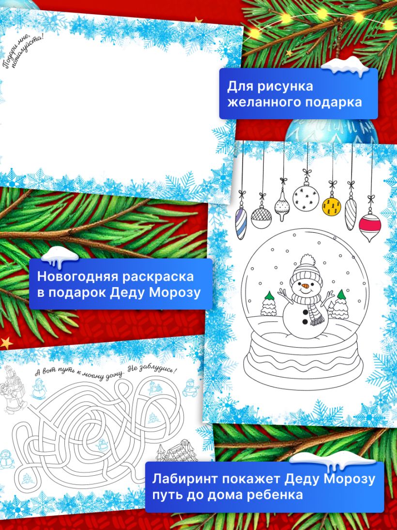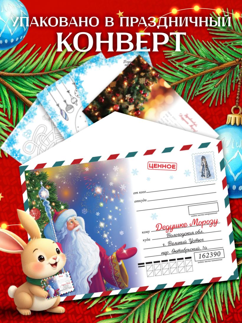 Новогодний набор для творчества «Моё первое письмо Деду Морозу» предназначен для детей 4—5—6 лет, он поможет подготовиться к зимним праздникам дома или в детском садике. Внутри — конверт с изображением Деда Мороза, макет письма с пунктирными печатными буквами для обводки и местами для собственного текста, а также обратная сторона с раскраской — новогодний рисунок в подарок Деду Морозу. Дополнительно есть лист с увлекательными заданиями: на одной стороне — место, где нужно нарисовать подарок, который дети хотят получить, на другой — лабиринт, ведущий к дому, создающий атмосферу праздничного ожидания. Картонная перегородка сохраняет письмо с конвертом и рисунки в целости, что удобно для использования для праздничных игр в детском саду, на утренниках. Этот подарочный набор для детей сочетает развитие творческого мышления, мелкой моторики и внимания с радостью новогоднего ожидания, а формат простого и недорогого подарка позволит выбрать его как подарок сыну, дочке, племяннику или племяннице. Это волшебный подарок, который гарантированно поможет превратить подготовку к празднику в тёплый семейный ритуал, а также использовать как часть праздничных игр и украшений.