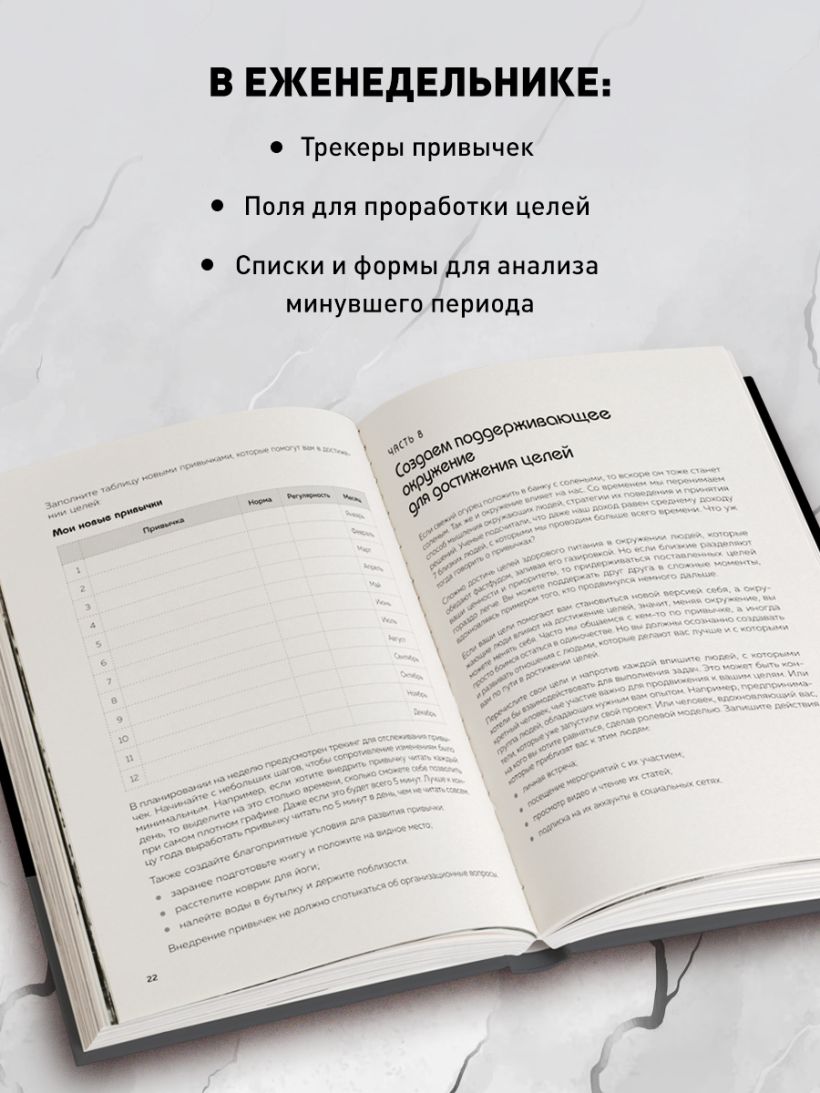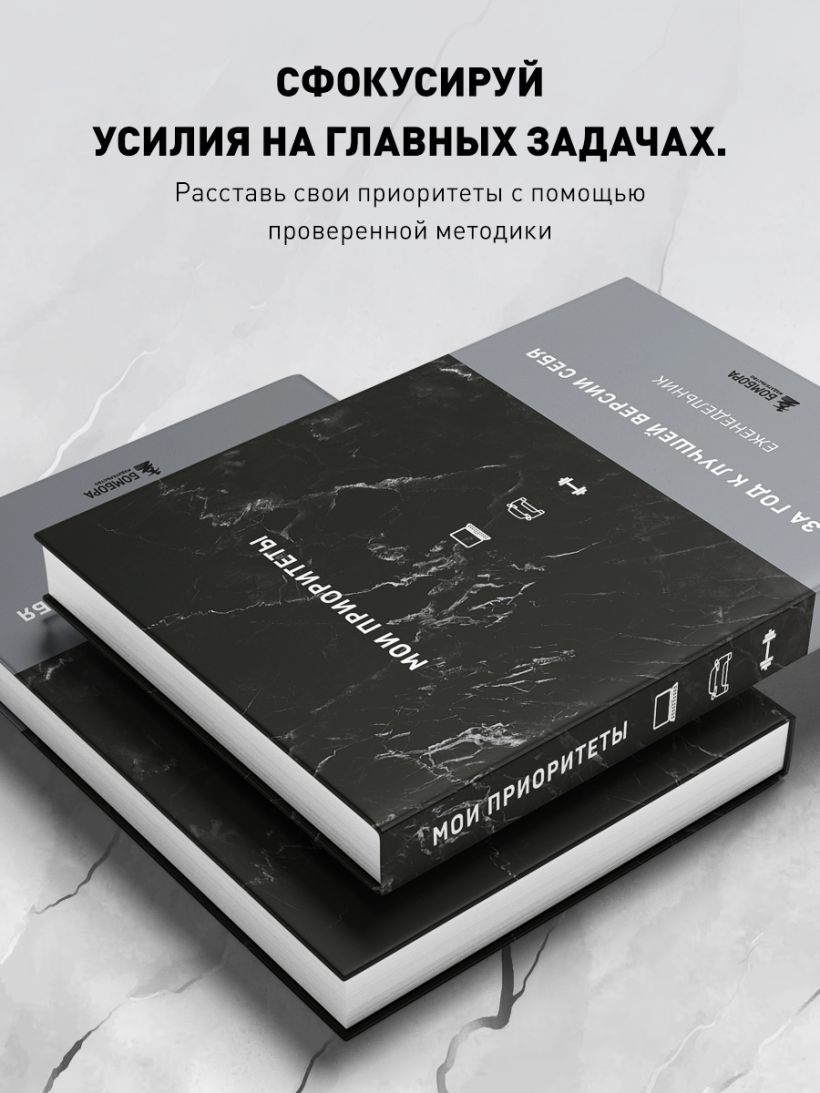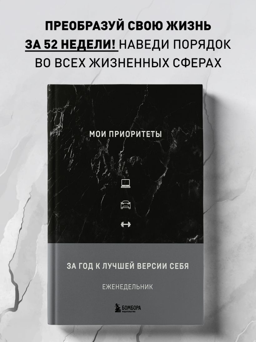 Этот еженедельник — программа полного преображения жизни за 52 недели с помощью постановки приоритетов. Он помогает сфокусировать усилия на главных задачах и навести порядок во всех жизненных сферах. Содержит трекеры привычек, поля для проработки целей на неделю, квартал и год, структурирующие списки и формы для анализа минувшего периода.