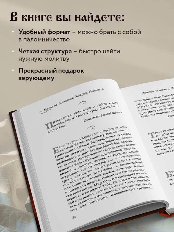 Сборник уникальных молитв к Блаженной Матроне Московской, почитаемой всеми православными людьми, с описанием ее жизни и духовных подвигов. Новинка серии «Православие. Молитвы и молитвословы». В помощь православному христианину, хороший подарок при крещении и человеку страждущему физически или духовно.