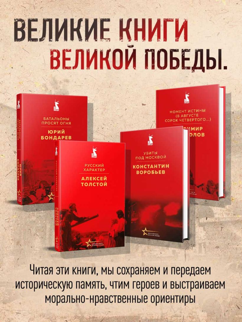 В этом году вся Россия и весь мир отмечает 80-летие Победы над фашизмом. Для каждого из нас Великая Война и память о ней — священна. К сожалению, живых свидетелей и героических участников страшных событий почти не осталось. Но у нас есть их воспоминания в книгах и фильмах военных лет. Цель серии — вспомнить главные книги победы, показать детям и подросткам важность их чтения, сохранить и передать главное слово о войне, написанное кровью и мужеством советских военных писателей.