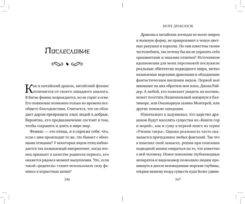 Это история об истинной отваге и чести, о верности друзьям и самому себе. Пусть приключения в этой истории совершенно фантастические, главный герой сталкивается с теми же вызовами, что и каждый из нас — как это важно, поверить в себя и чтобы в тебя кто-то верил. В «Море драконов» вас ждёт не только увлекательный сюжет, но и встреча с персонажами старинных китайских мифов, которые просто поражают своим разнообразием и обликом. А ещё в 2024 году планируется экранизация первой книги серии.